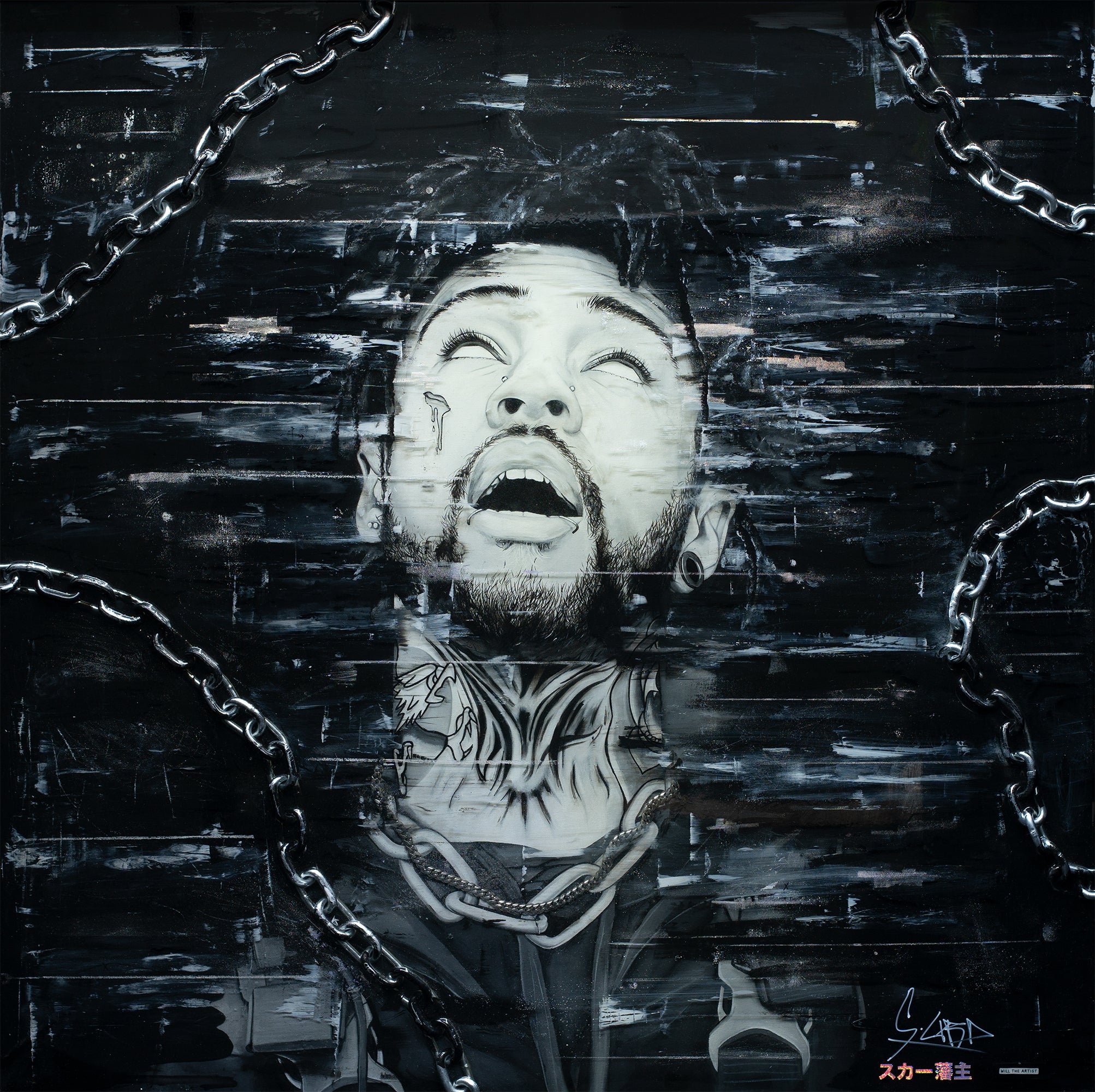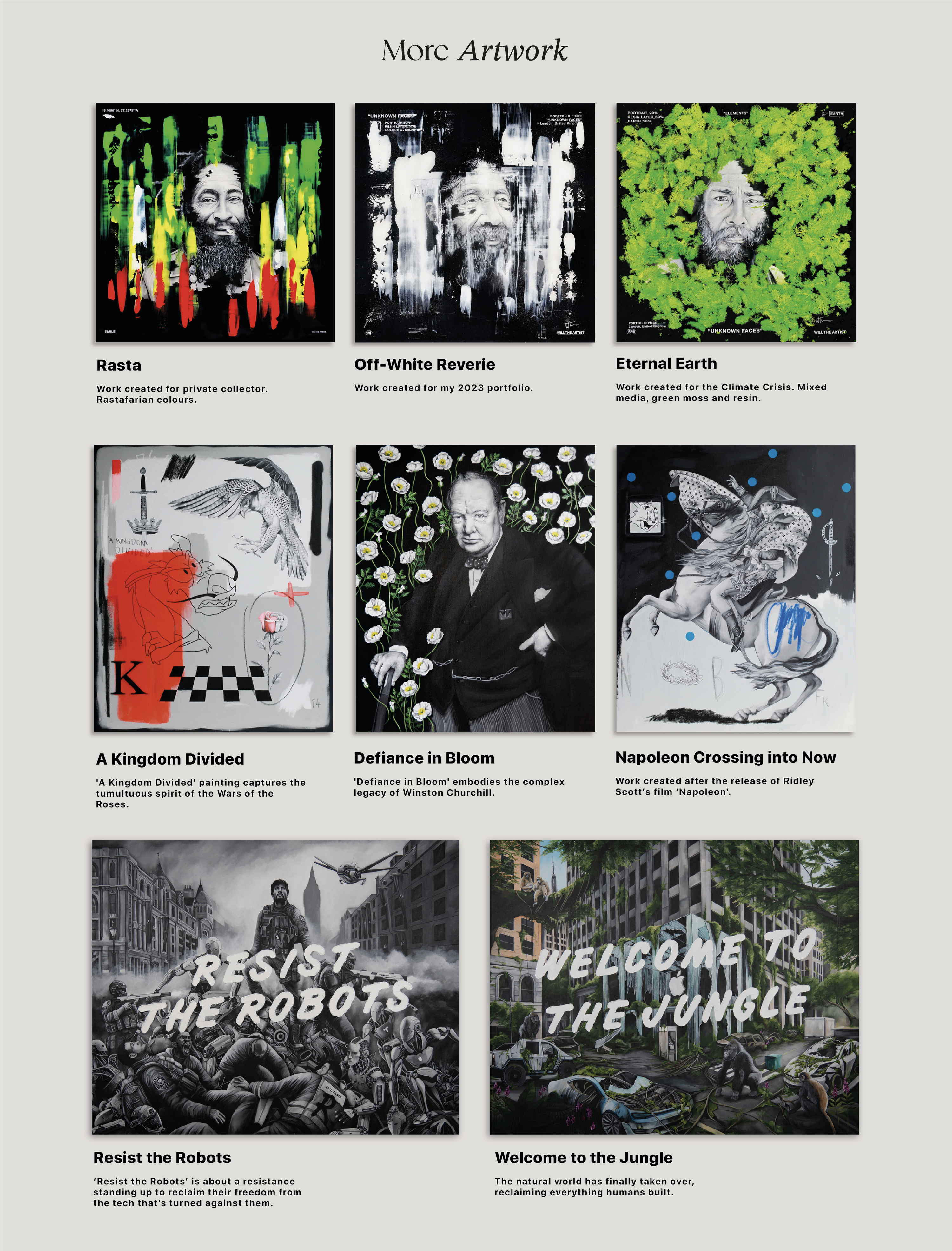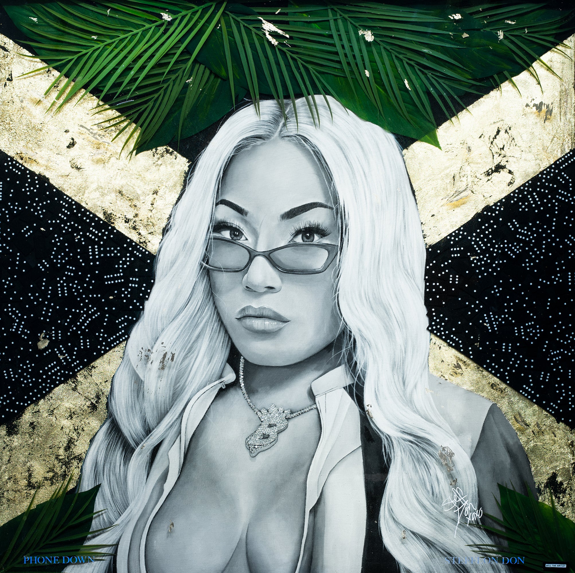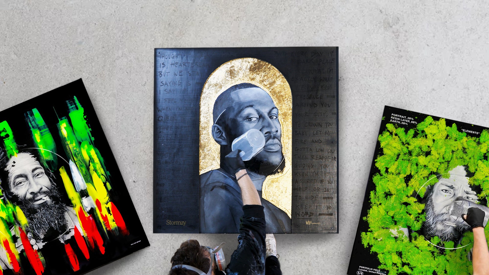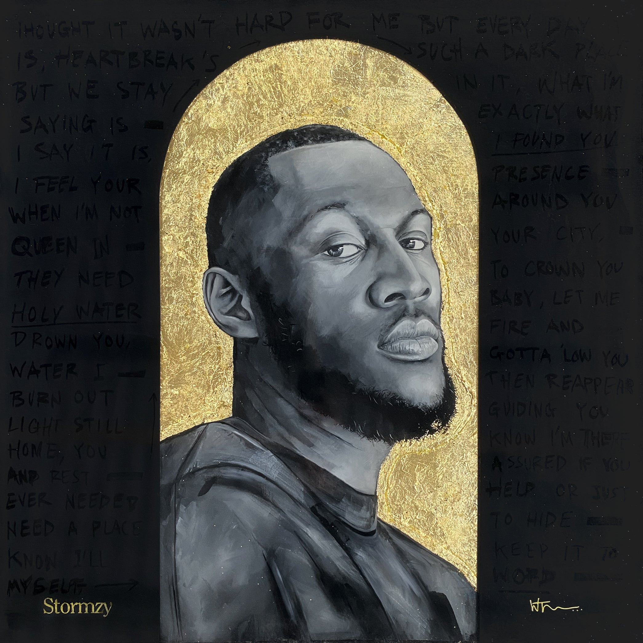 A portrait of Stormzy, created to mark the release of his album This Is What I Mean. Mixed media with gold leaf accents and subtle handwritten lyrics woven into the piece.